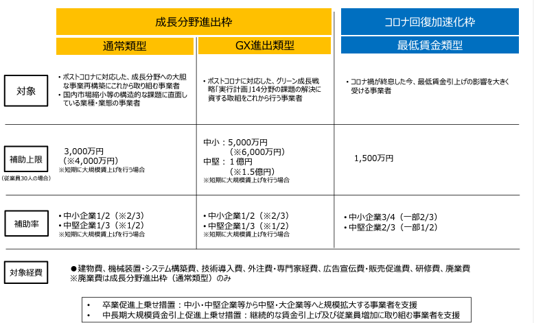 第13回は3種類の事業類型に纏められました。第12回で実施されたコロナ回復加速化枠(通常類型)、サプライチェーン強靱化枠は第13回での公募はありません。